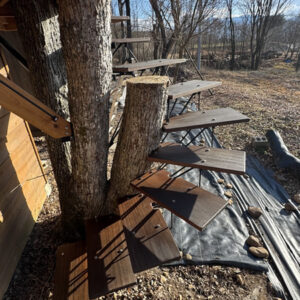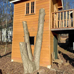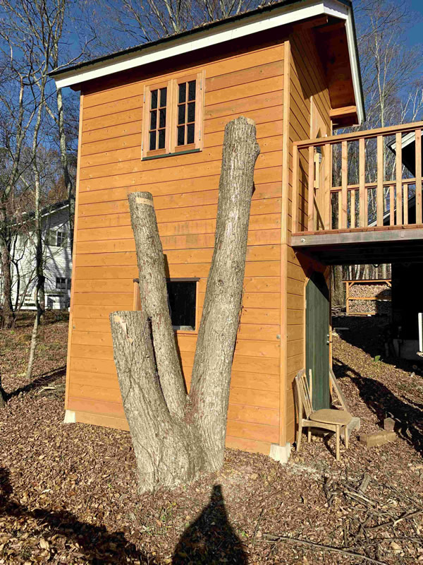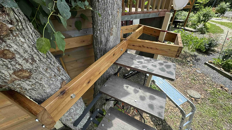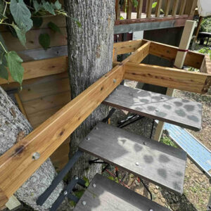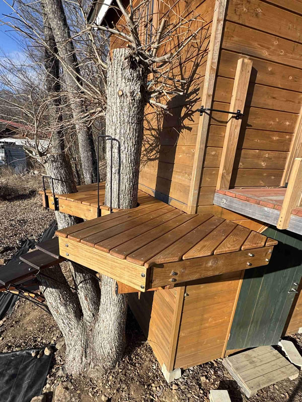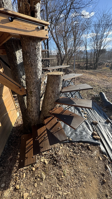子供の為の遊び場(2階建小屋)横の木を伐採する事になりましたが、そこに外階段を付けたら面白いかなと作ってみました。